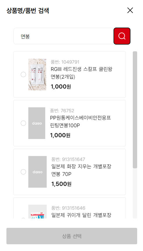 "매장 상품 찾기"에서 원하는 물품의 이름이나 번호를 입력하고 [검색] 버튼을 누릅니다. 예를 들어, 저는 '리들샷'을 검색해 볼게요. 여러 종류의 제품이 뜰 경우, 원하는 제품을 정확히 찾아 체크하고, [상품 선택] 버튼을 클릭합니다.